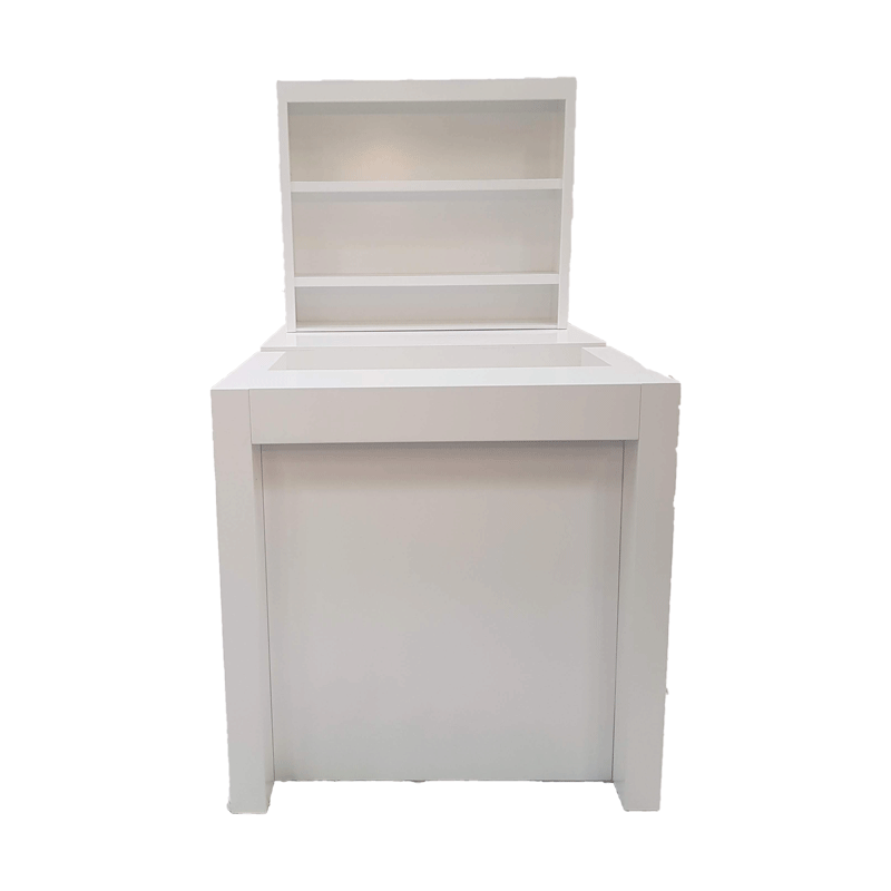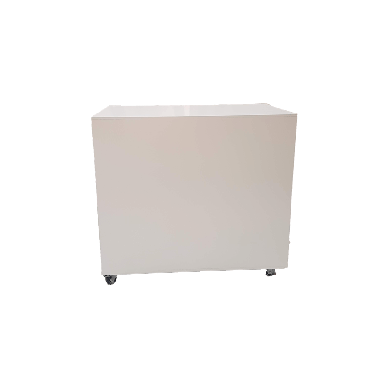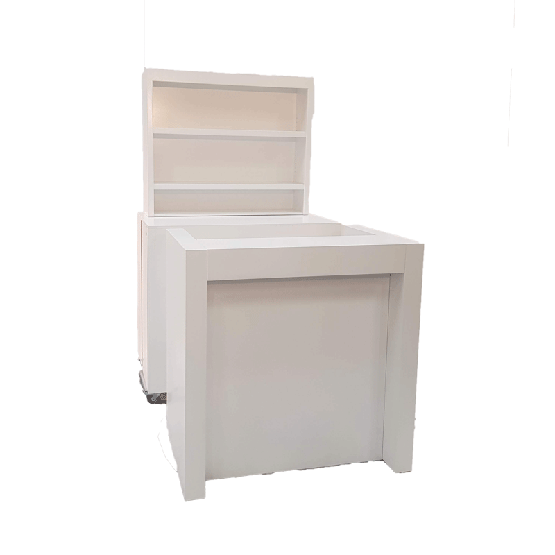 Huur de bardeel 120 met backbar en bovenkast in het wit nu direct bij Kubic Verhuur.